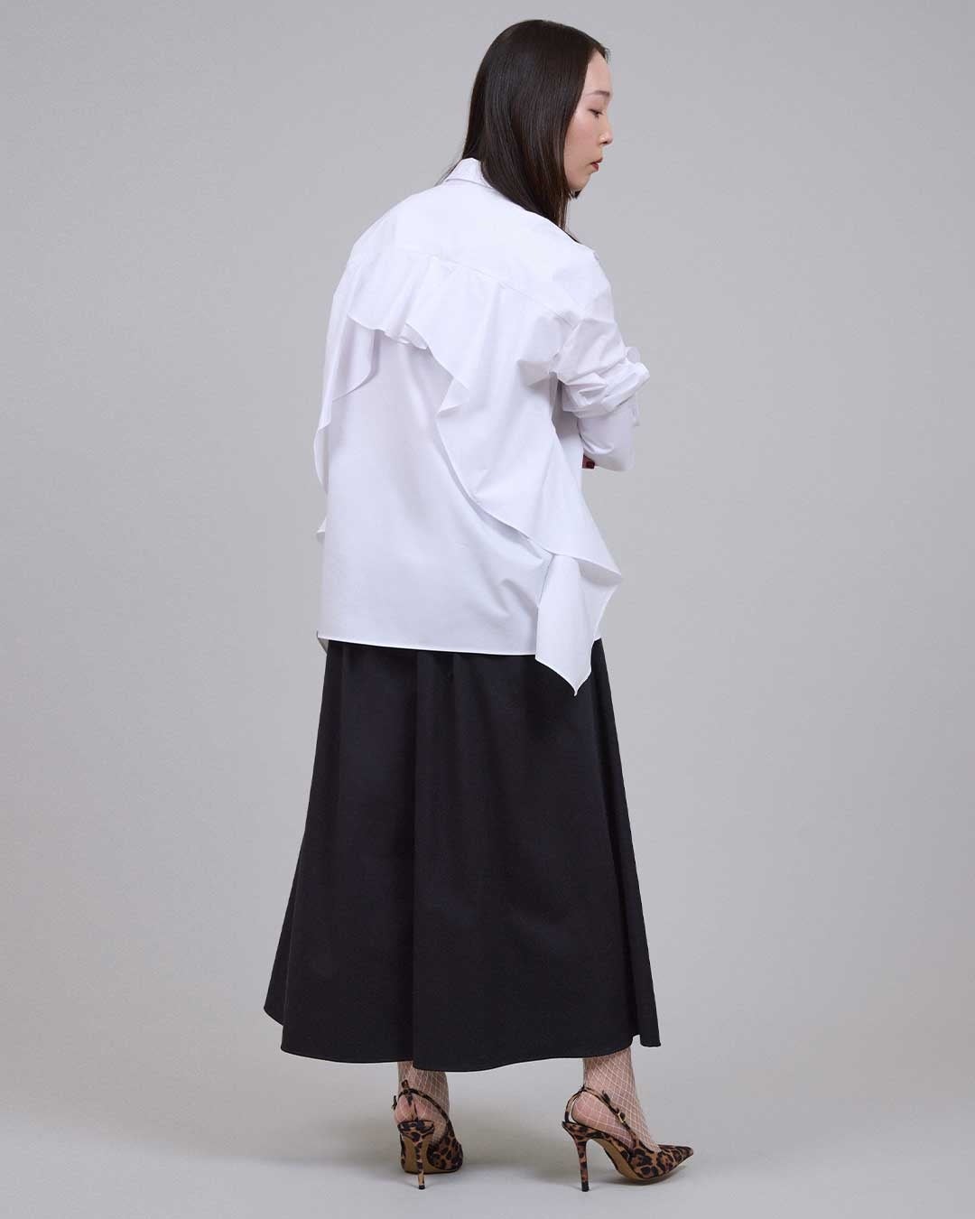 02:定番シャツ&フレアパンツは、あえての重ためバランスが新鮮!
