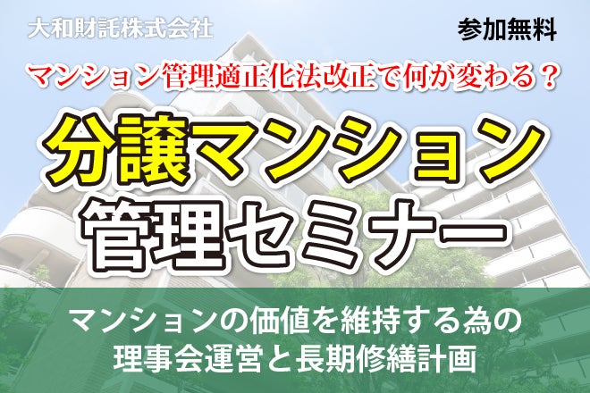 収益不動産を活用した資産運用コンサルティング事業を展開する大和財託株式会社(本社:東京都渋谷区/大阪府大阪市 代表取締役CEO:藤原正明、以下「当社」)は令和4年3月19日(土)に分譲マンション管理組合を対象としたオンラインセミナーを初開催します。