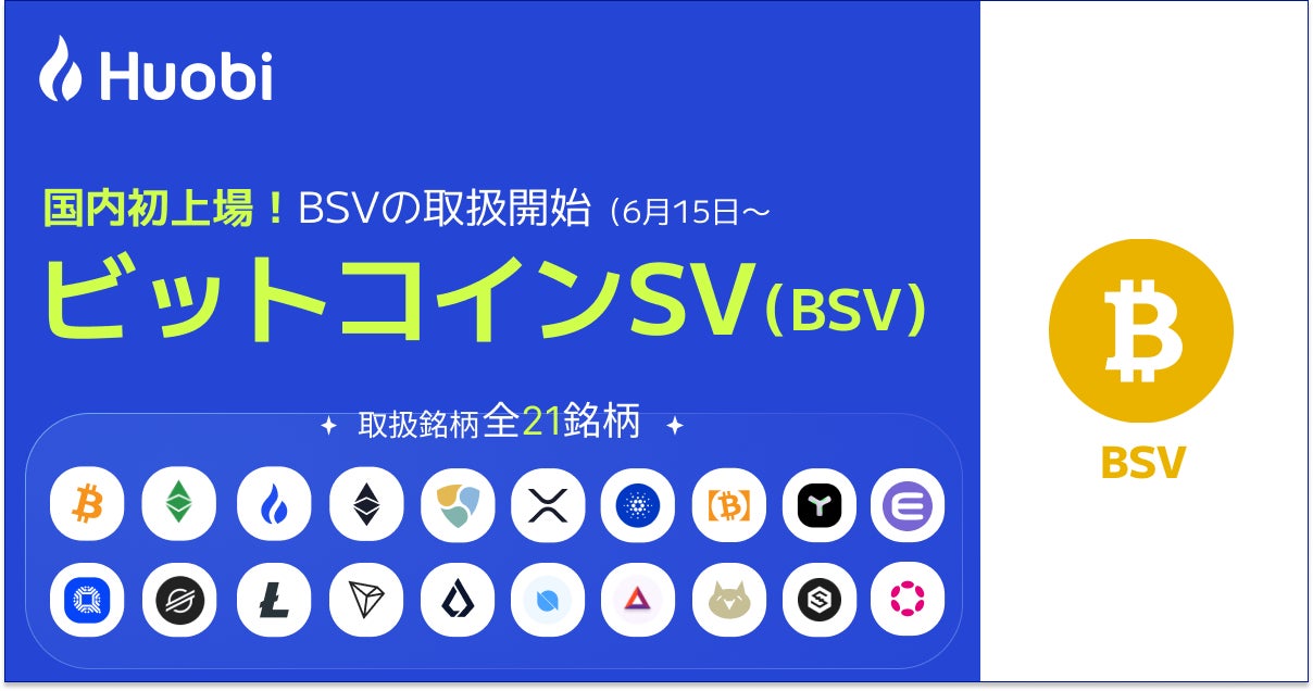 フォビジャパン株式会社(所在地:東京都港区、代表取締役社長:関 磊、以下「フォビジャパン」)は、暗号資産 ビットコインSV (BSV) の入出金、販売所・取引所での取扱いを6月15日(水)(予定)より開始することをお知らせいたします。 これにより、フォビジャパンの取扱暗号資産は21銘柄となります。