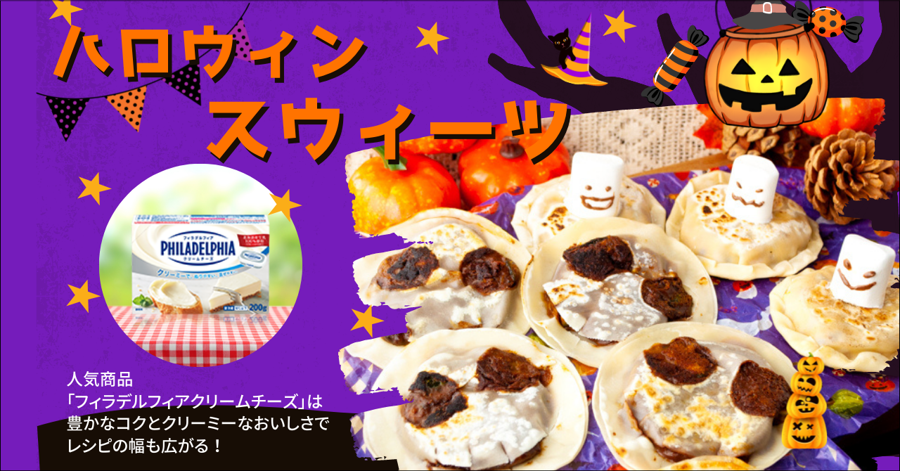 森永乳業とは2021年4月から毎月1〜2回授業を開催しており、今回は人気商品「フィラデルフィアクリームチーズ」を使用した2種類の「パンプキンスイーツ」を作ります。