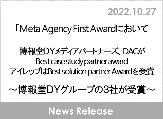 Meta日本法人Facebook Japanが主催するMeta Agency First Awardにおいて、博報堂DYグループの株式会社博報堂DYメディアパートナーズ(本社:東京都港区、代表取締役社長:矢嶋弘毅、以下 博報堂DYメディアパートナーズ)およびデジタル・アドバタイジング・コンソーシアム株式会社(本社:東京都渋谷区、代表取締役社長 執行役員CEO兼CCO:田中雄三、以下 DAC)が、Best case study partner awardを受賞いたしました。