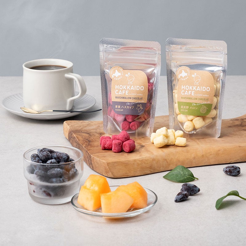 同シリーズの第一弾商品として好評販売中の「厚真ハスカップ珈琲」とのアソートパック、それぞれのフルーツを使ったスイーツ「マシュマロショコラ」も同時発売です。