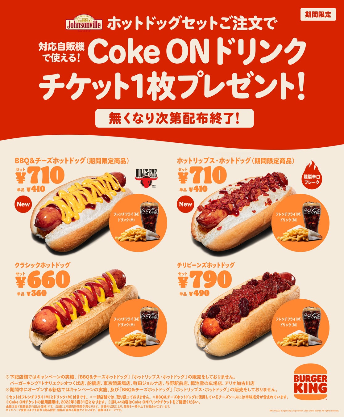 ぜひこの機会に「Coke ON®ドリンクチケット」がもらえるお得なキャンペーンをご利用いただき、バーガーキング® の全米No.1※1 ソーセージ「ジョンソンヴィル」を使用した本格的で食べ応え抜群のホットドッグセットをお楽しみください。