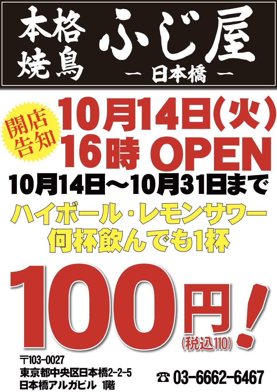 オープン記念!ハイボール・レモンサワーが何杯でも100円キャンペーン開催!