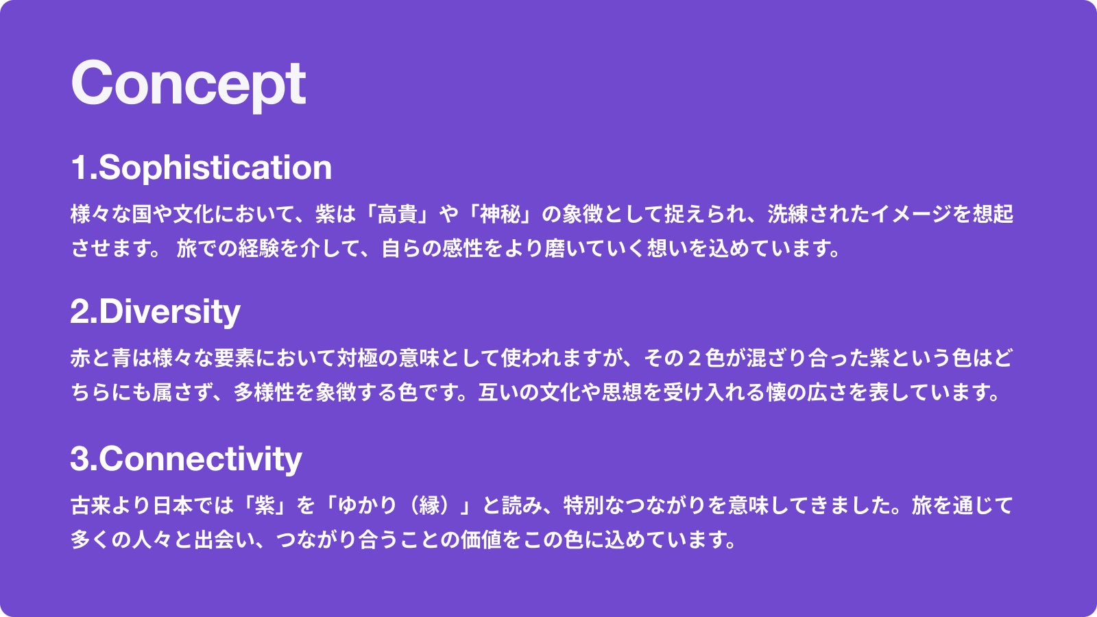 新しいブランドカラーは、Sophistication / Diversity / Connectivity の3つをキーコンセプトにしつつ、紫を基調としたカラーに一新します。