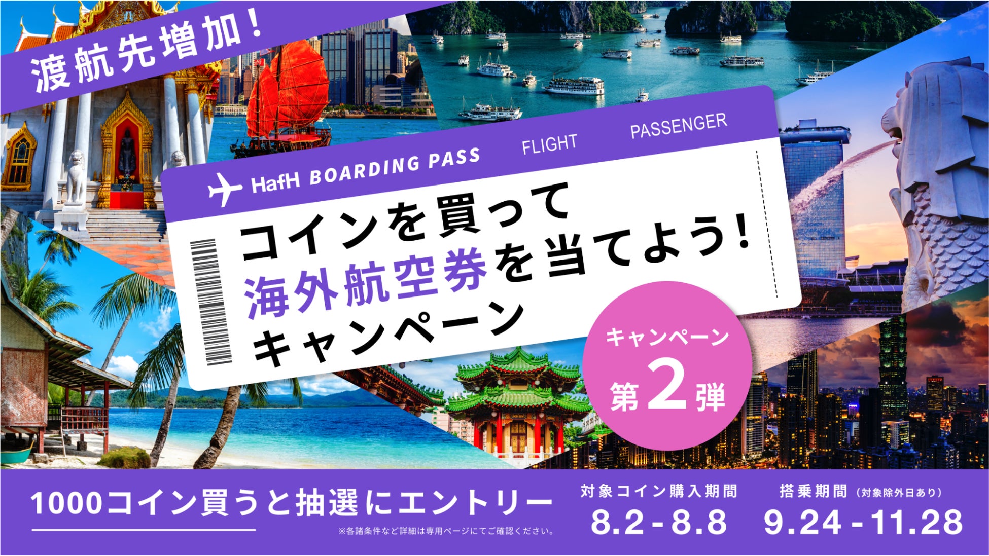 本キャンペーンでは、HafHで1000コイン以上を購入すると、15%の確率で海外航空券(1区間)が当たる抽選にエントリーいただけます。
