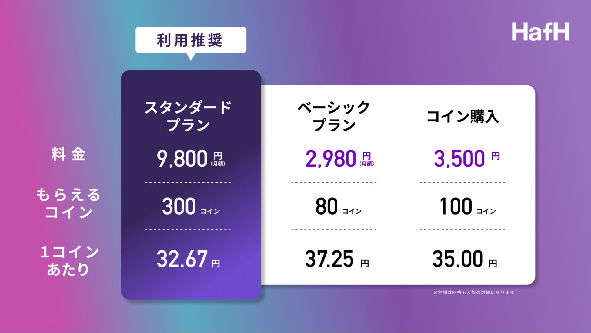 ユーザーの皆様にサブスクサービスを通じて、旅をより身近に感じていただきたいという思いから、HafHが最も推奨するスタンダードプランをお得にご利用いただくため、「コイン購入」の価格改定を実施いたします。価格改定は以下の通りです。