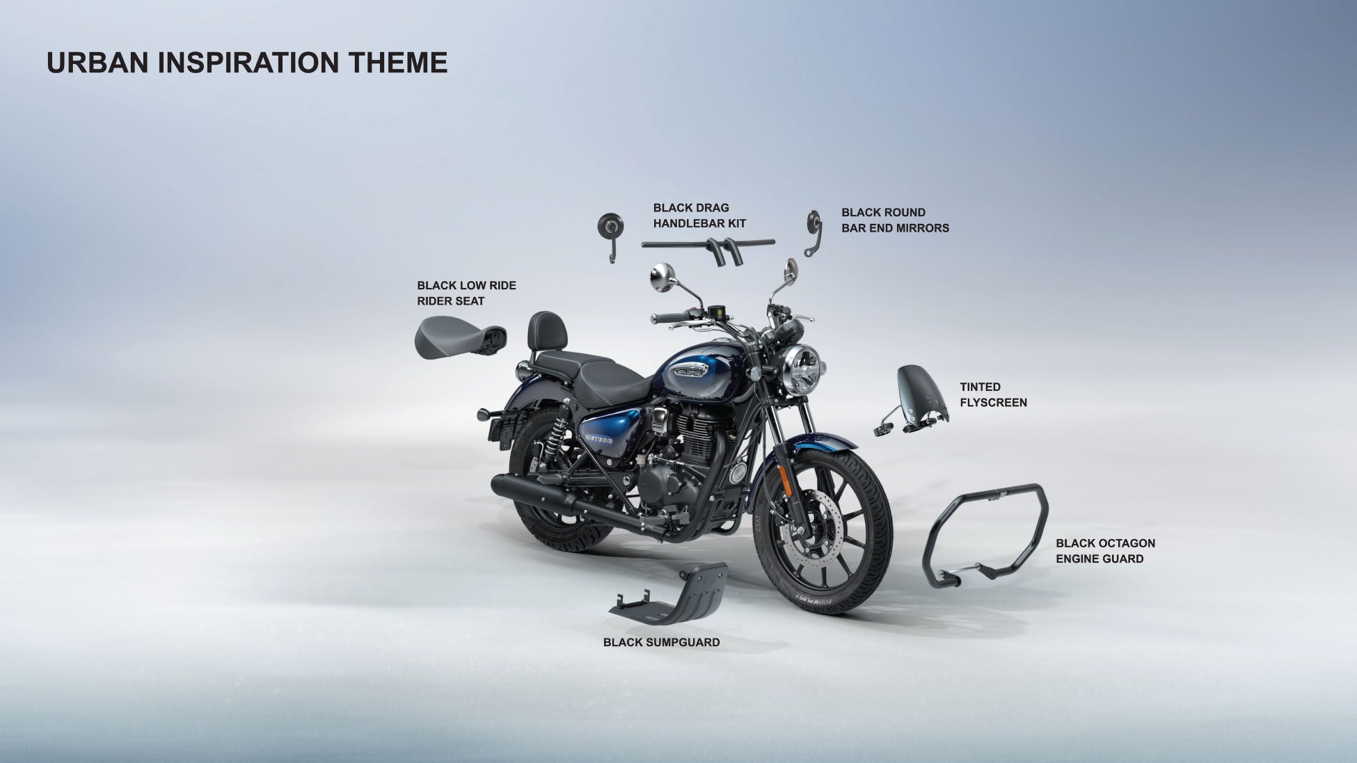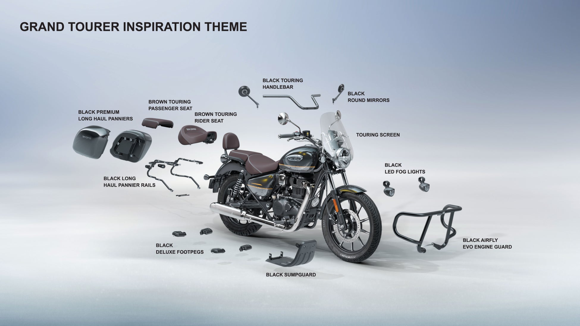 2026年モデルのMETEOR 350には、各バリエーションの個性を引き立てる純正アクセサリー「Royal Enfield Accessories」も用意しました。アクセサリーは2つのテーマで構成しました。「Urban Kit(アーバン・キット)」にはブラックのドラッグハンドルバーにブラックのバーエンドミラー、ローライダーダーシート、スモーク・フライスクリーンなどを装備。一方の「Grand Tourer Kit(グランド・ツアラー・キット)」には、ブラウンのツーリングシート、ブラックのプレミアムパニアとパニアレール、デラックスフットペグ、ブラックのツーリングハンドルバー、LEDフォグランプなどを含み、より本格的なツーリング仕様を実現します。