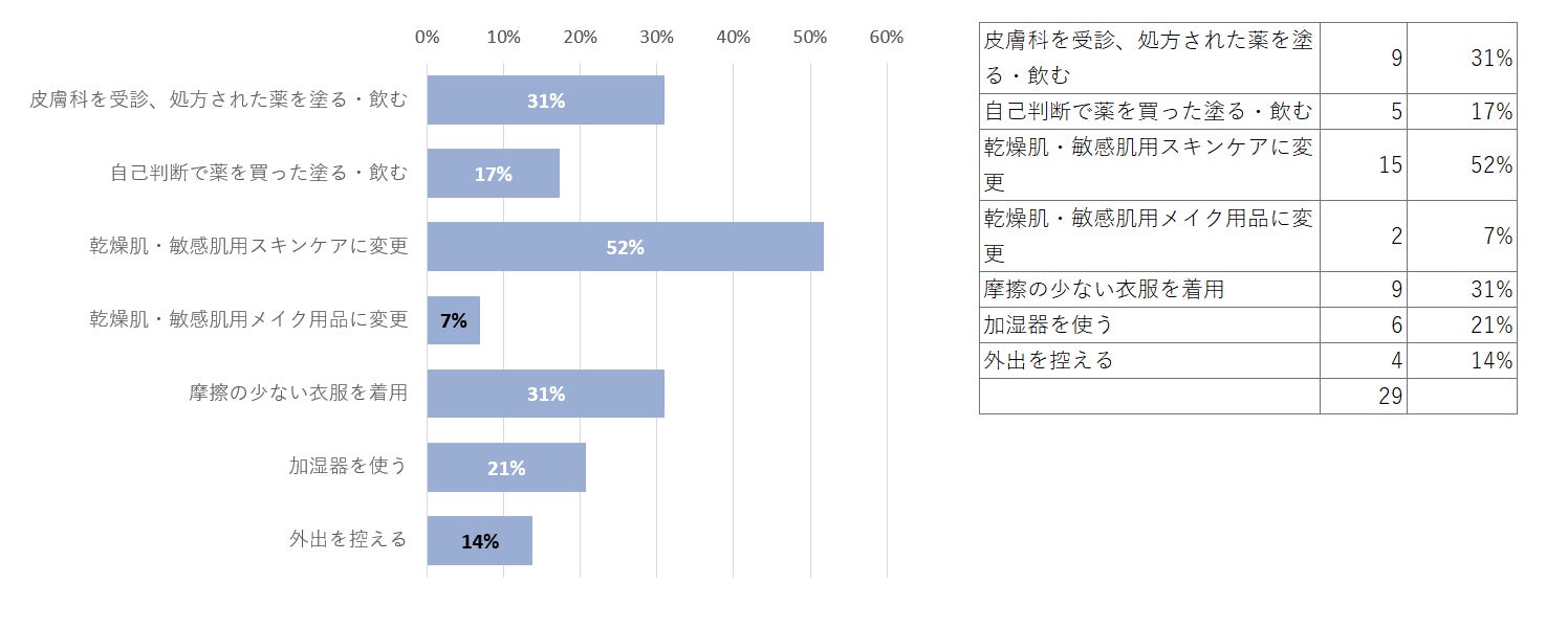 乾燥肌や敏感肌用のスキンケア商品を使用する人が半数以上であり、皮膚科への通院率も30%以上であることが明らかになりました。調査対象がかゆみ対策インナーを購入された方ということもあり、摩擦の少ない衣服を選ぶ人も30%以上います。