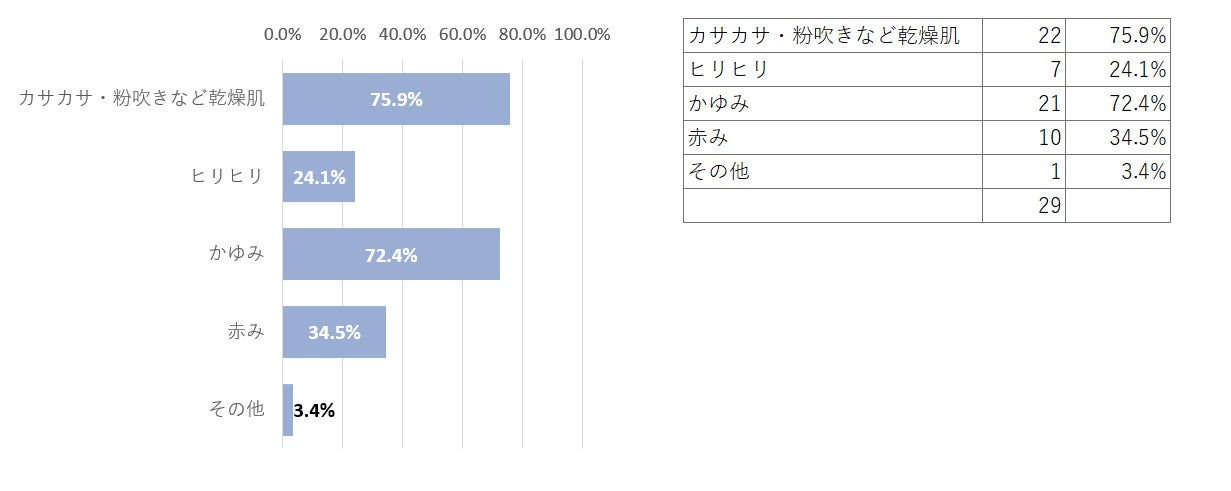 肌トラブルが「顔だけの人」や「顔・体(一部)の両方」が多いことが示されました。さらに、全身に肌トラブルが起こるという報告もあり、花粉症時期の肌トラブルの厳しさが浮き彫りになります。