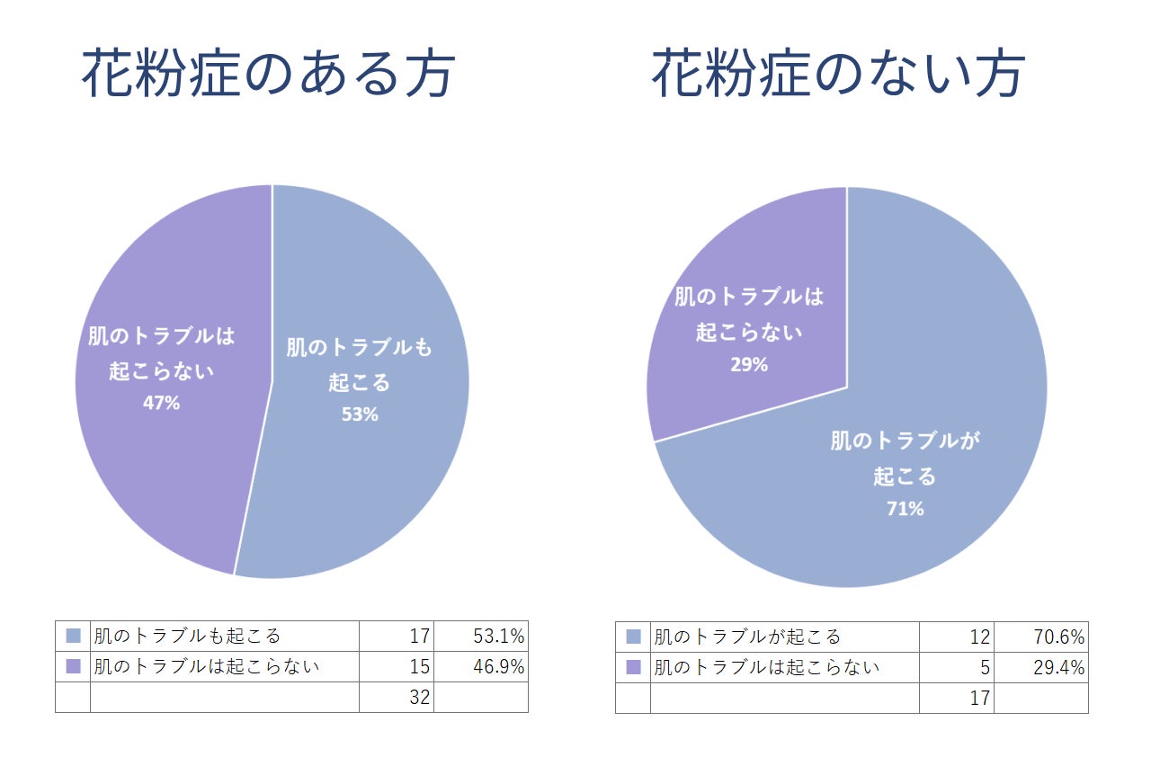 ・花粉症を発症している方は、同じ時期に肌トラブルを起こす方が53%