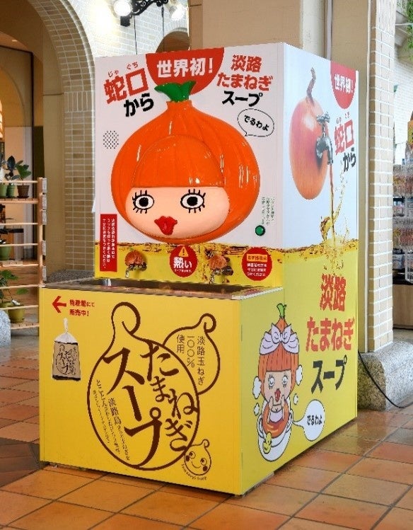 2つの蛇口から注がれる100%淡路島産の玉ねぎを使用したスープは、コンソメ味。機器の外観イメージは、淡路ハイウェイオアシスのゆるキャラ「淡路タマ子さん」を立体的に再現しています。スイッチを押すとお話しする、おもしろ機能を搭載しております。