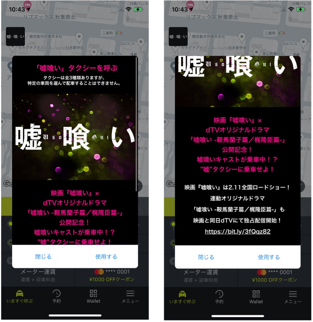 この度、迫稔雄作のシリーズ累計880万部突破の人気漫画「嘘喰い」(うそぐい)を実写化した映画『嘘喰い』の公開(2022年2月11日(金)より全国で公開)と、映像配信サービス・dTV®にて、映画にも登場する人気キャラクターに焦点を当てたオリジナルドラマ「噓喰い -鞍馬蘭子篇/梶隆臣篇-」の独占配信(2022年2月11日(金)より配信 全4話)を記念し、本日2月7日(月)〜2月20日(日)まで、「Canvas」を活用した『嘘喰いタクシー』50台(大和自動車交通株式会社・国際自動車株式会社)が都内を走行することをお知らせします。走行期間中は、タクシーアプリ「S.RIDE」にて『嘘喰いタクシー』の指定配車が可能です。配車までの手順に関しては、以下よりご確認ください。