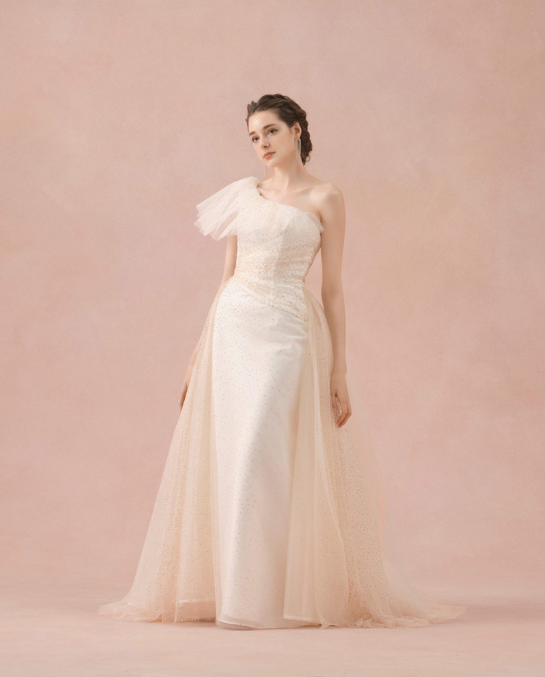 トレンドのグリッター素材で仕立てた、スタイリッシュなドレス。 シャンパンピンクのグリッターをウエスト回りから流れるようにあしらうことでスタイルアップを叶えます。 オーバースカートは空気をはらむ立体的なシルエットに仕上げました。 ボリュームのあるワンショルダーのフリルが花嫁様のお顔まわりを華やかさを引き立てます。