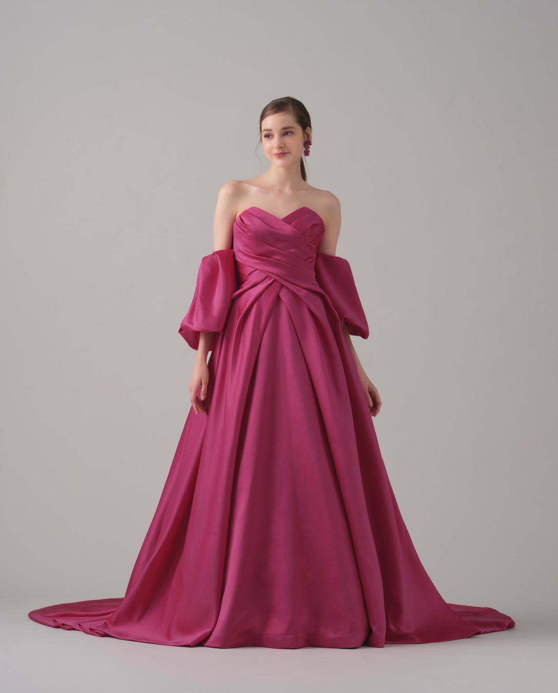 とろみのある柔らかなサテンで仕立てたエレガントなチェリーピンクのドレス。 花びらのように角度をつけたネックラインはデコルテがすっきりと美しくエレガントに見えます。 存在感のあるパフスリーブは抜け感を出すためにスリットを入れ、手首にかけてたっぷりと生地をあしらうことで手首の細さが際立ち、腕の細見え効果も。
