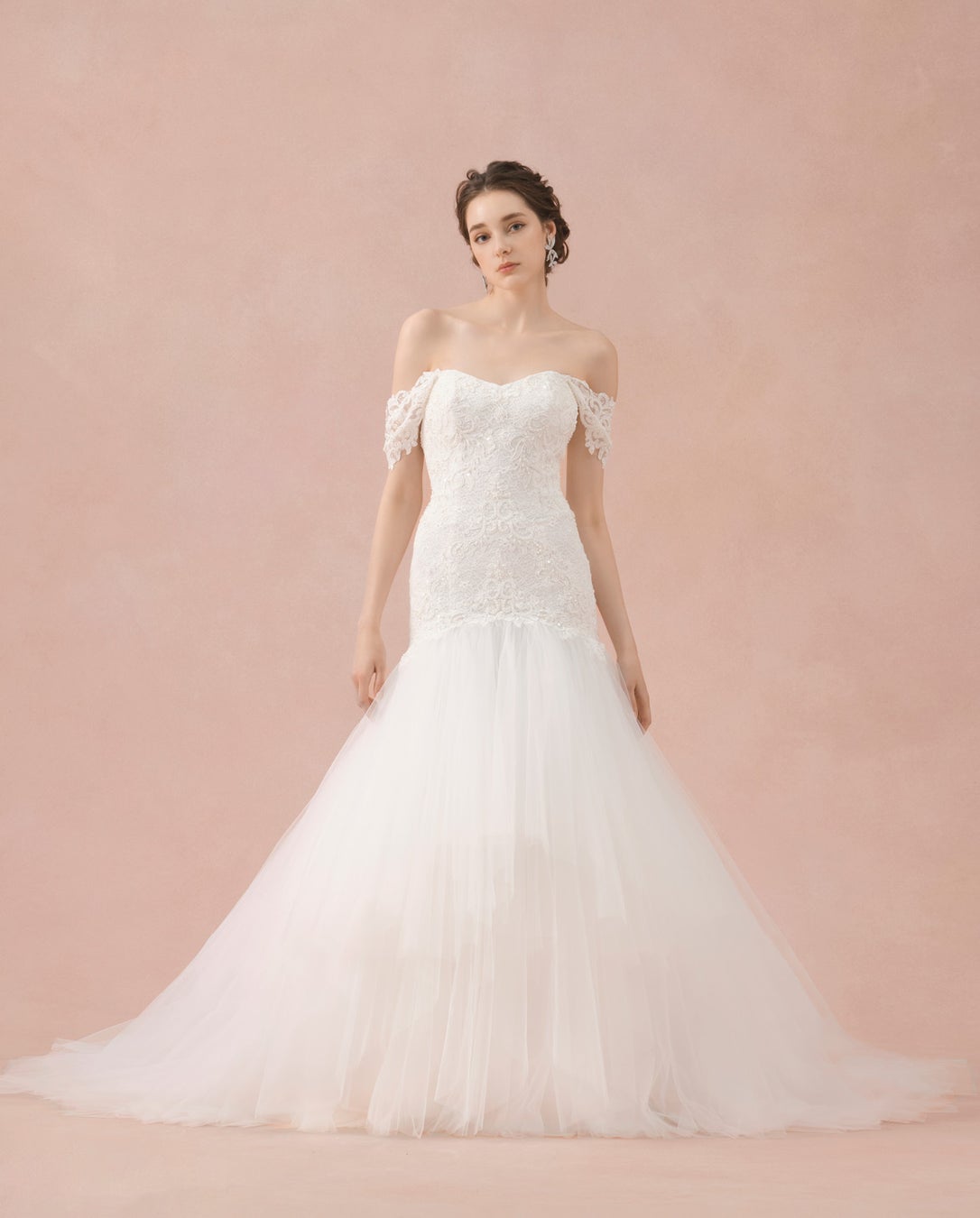 女性らしい曲線美が際立つ、マーメイドドレス。ストレッチ素材によりボディラインを美しく綺麗に見せ、着心地にもこだわった1着にボディはグリッターチュールの上にエンブロイダリーレースを重ね、繊細な輝きにこだわりました。チュールを贅沢にあしらったボリューム感たっぷりのスカートが花嫁様の華麗な美しさを引き立てます。