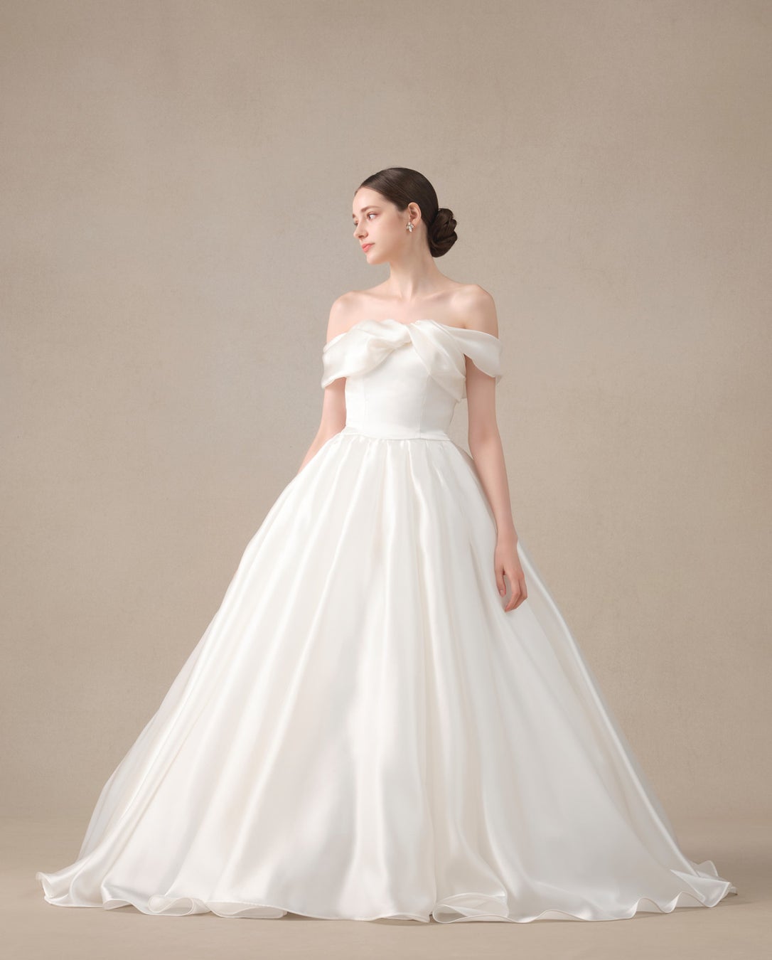 花言葉が「愛情、固い約束」のアサガオの蕾がゆっくりと花ひらく様子をドレスに表現しました。ネックラインは、蕾のねじれがほどけるようなイメージのツイストドレープ。ダーツを組み合わせた3Dスカートは、アサガオが花ひらいたようなシルエットです。立体感が特徴のクチュールテクニックを要するデザインで仕上げました。アサガオのツルが固く結ばれながら伸びるイメージから、おふたりの深い結びつきを象徴します。明るい光に包まれ、幸福感が香りたつドレスです。※バックリボンは取り外し可能です。