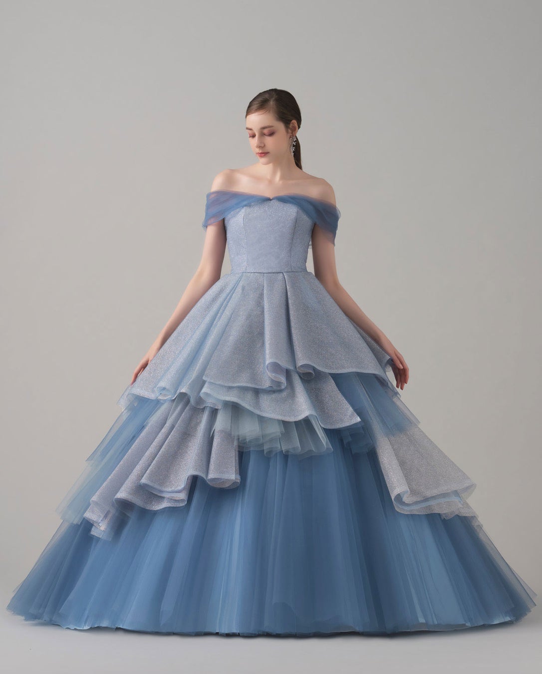 ときめくグリッターの輝きとティアードスカートがポイントのドレス。 目を奪うような輝きを放つグリッターの粒は、ひとつひとつがさまざまな角度に光を放つよう多面的なカットが施されています。 スカートはティアードをランダムに配置し、クチュールのテクニックでシルエットに変化を持たせました。まぶしいほど輝く主役にふさわしいプリンセスドレスです。