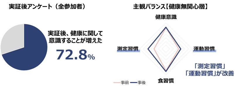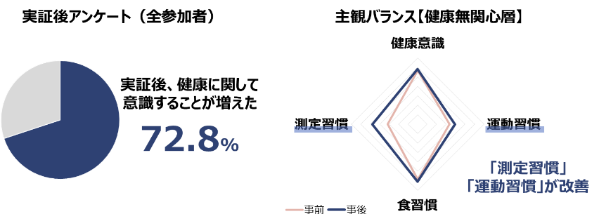 実証後アンケートより72.8%が「実証前と比べて健康に関して意識することが増えた」と回答しており、参加者の健康意識の変化が確認できました。「健康意識」「運動習慣」「食習慣」「測定習慣」に関する項目を点数化した主観バランスの変化をみると、特に健康無関心層が健康関心層と比べて数値の改善がみられました。