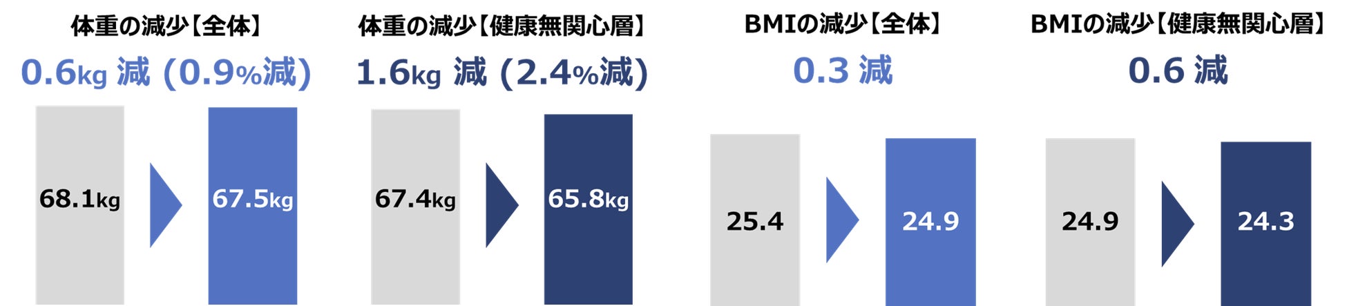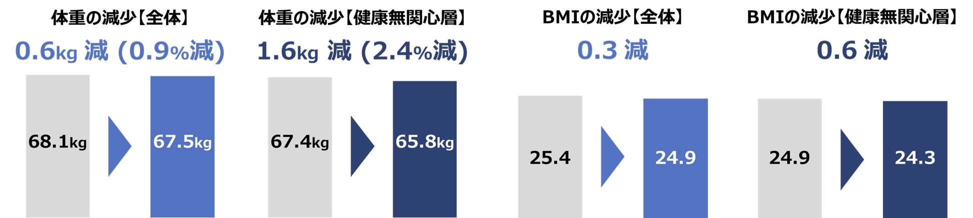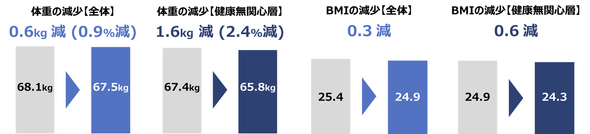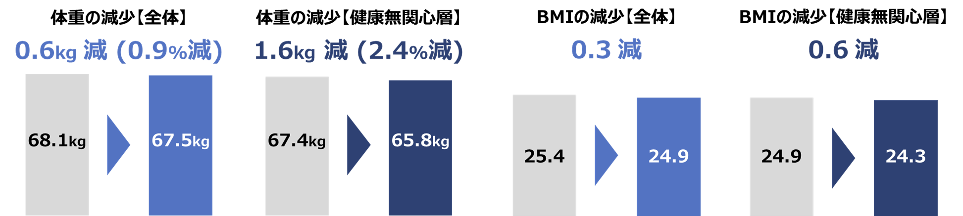 2024年1月~3月の参加者全体の平均体重は0.6㎏減、BMIは0.3減、健康無関心層においては平均体重1.6㎏減(体重2.4%減*4)、BMI0.6減とより有意な体重減少が確認できました。