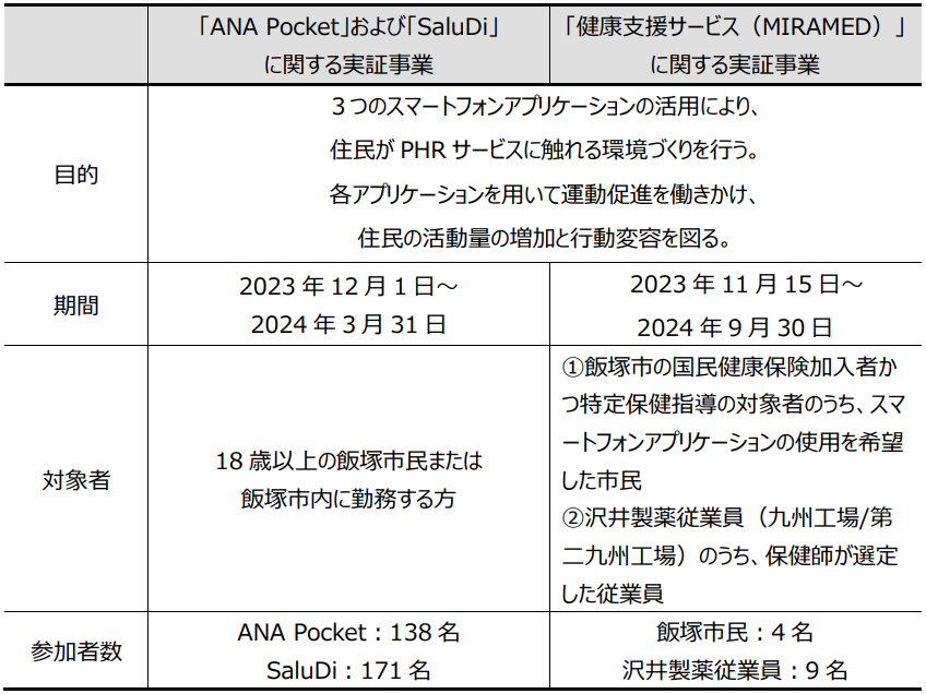 本実証事業は、飯塚市と日本ウェルビーイングコンソーシアムの設立企業である日立システムズ、インテグリティ・ヘルスケア、ANA X、沢井製薬が、「健康無関心層の取り込み」、「特定保健指導のデジタル化」、「地元企業との連携による健康経営の支援」の実現に向けてPHR基盤と各社のアプリケーションを活用し、実施しました。