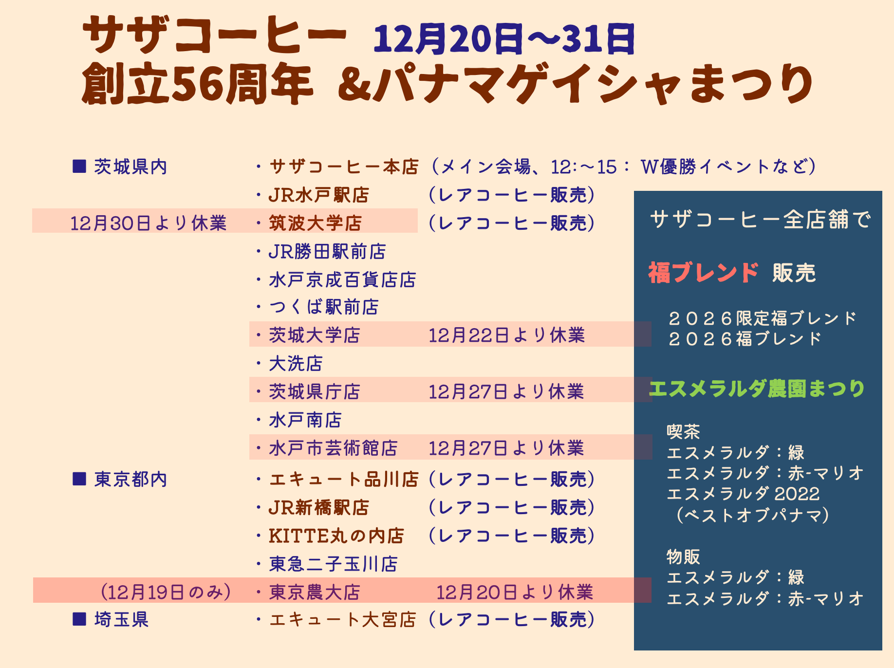 ◆【限定発売】ゲイシャまみれの「福ブレンド」開始 ◆サザコーヒー バリスタ日本W優勝のコーヒーが飲めます。・本間啓介バリスタ ・飯高亘バリスタ ◆ベストオブパナマのゲイシャが飲めます。・エスメラルダ農園など ◆誕生祭なのでめでたいお菓子の試食などある。◆サザコーヒーの話をみんなでします。 ・コロンビアにあるサザコーヒー農園の話、・コーヒーの買い付けの話。