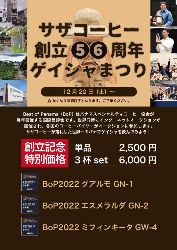 サザコーヒー(茨城県ひたちなか市 代表:鈴木太郎 )は12月20日12時から、サザコーヒー17店舗(下記の詳細に注意)で「サザコーヒー 創立56周年 ゲイシャまつり」を行います。
