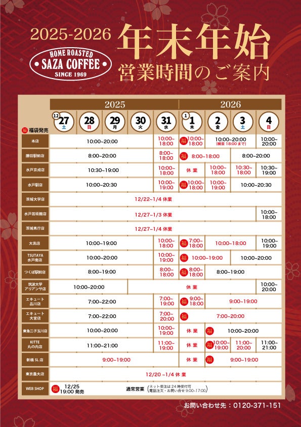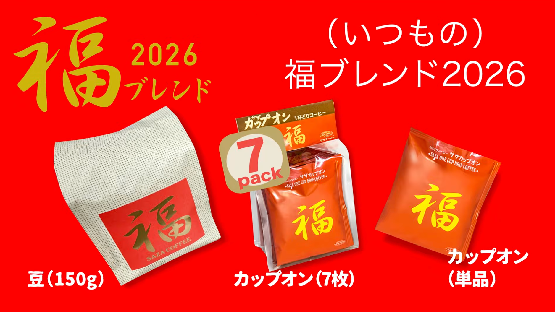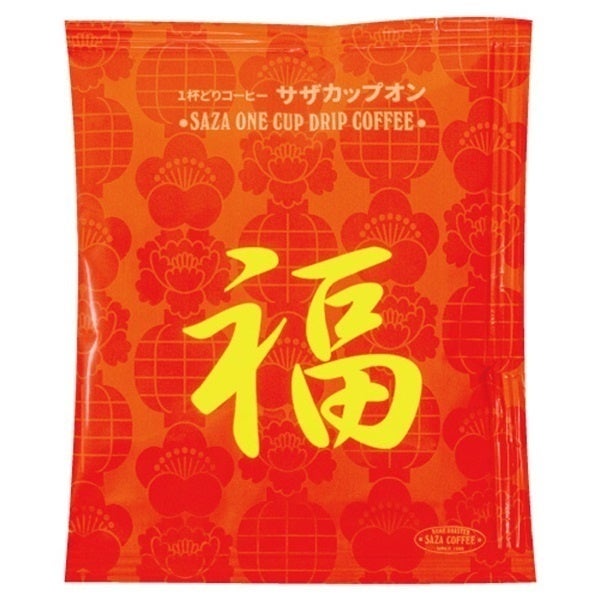 全店舗で毎年1円づつ値上がりする限定ブレンドコーヒーの物販販売をします。サザコーヒーにとっても縁起物で貯めた福をお客様に年に一度還元せねば、新たな福が入ってこないと信じており、使っているコーヒーはエスメラルダ農園などのパナマゲイシャをふんだんに使っています。お客様にとっては年に1度コスパの良いコーヒーが手に入ります。またサザコーヒーの工場で作られる「1杯どりコーヒーサザカップオン」は企業努力で賞味期限が5年に延長されて香りが長持ちしています。