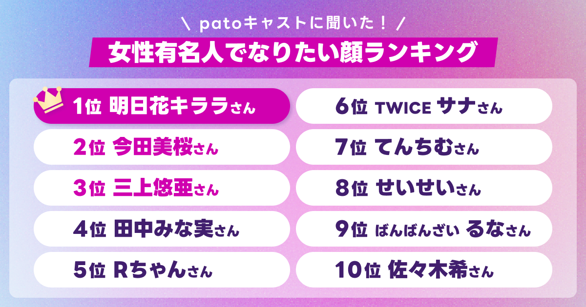 美意識の高いpatoキャストに聞いた!「女性有名人でなりたい顔」アンケートで明日花キララさんがNo.1に!