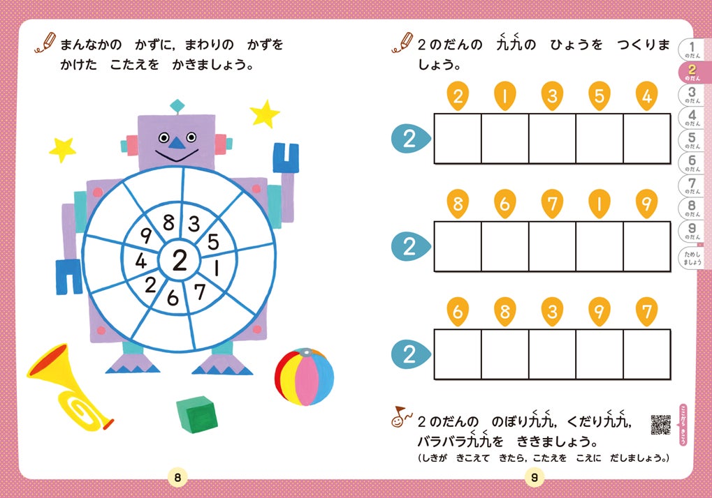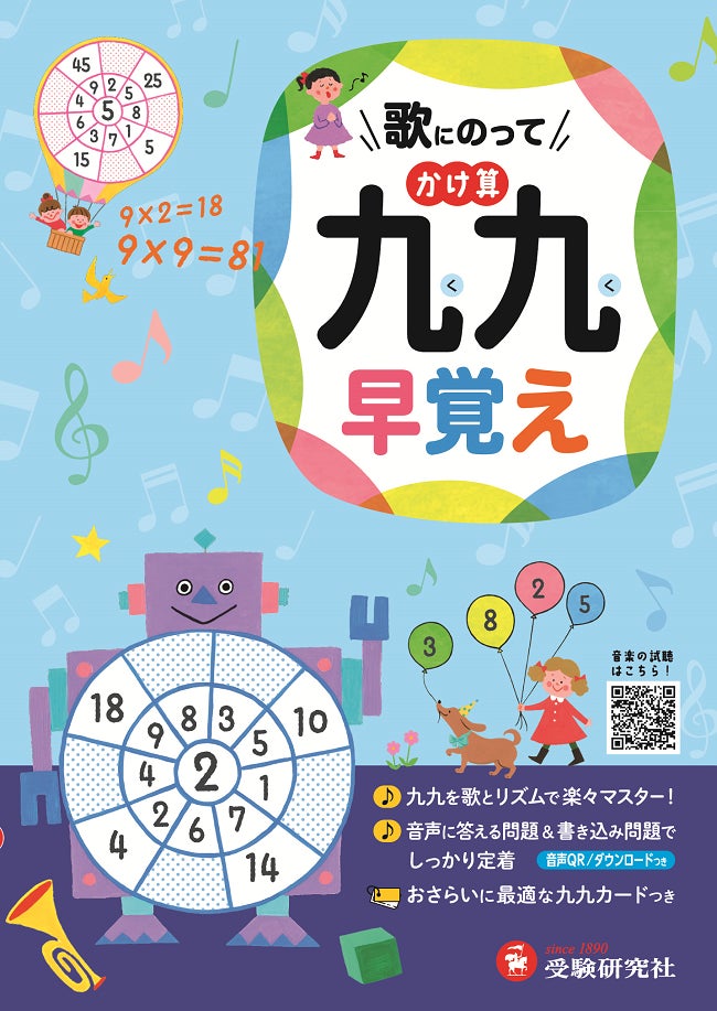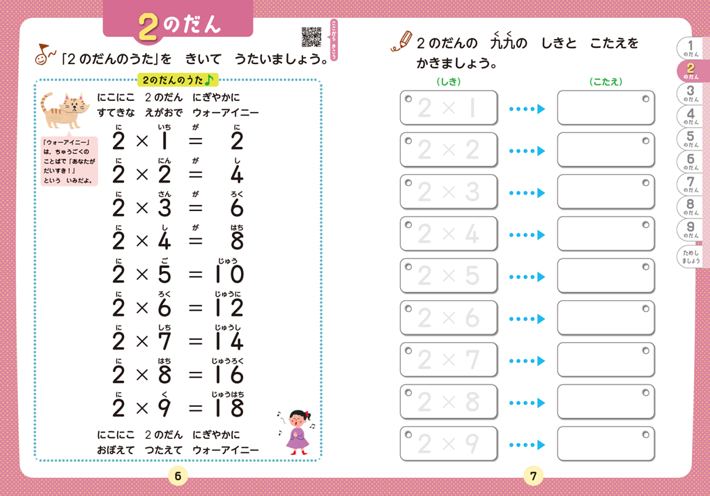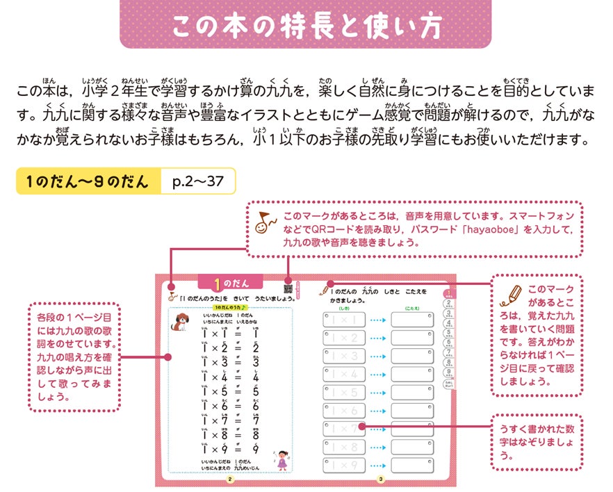 各段の九九の唱え方を歌詞に織り交ぜた「九九の歌」(全9曲)と、「のぼり九九」「くだり九九」「バラバラ九九」などの音声による練習問題をQRコードから読み取ることができます。