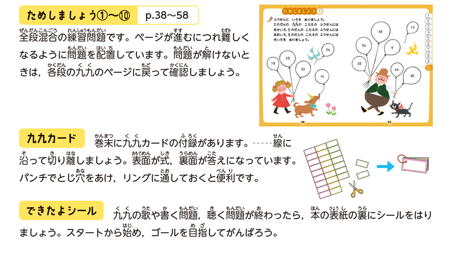 巻末には持ち運びに便利な九九カード(6ページ)が付いています。