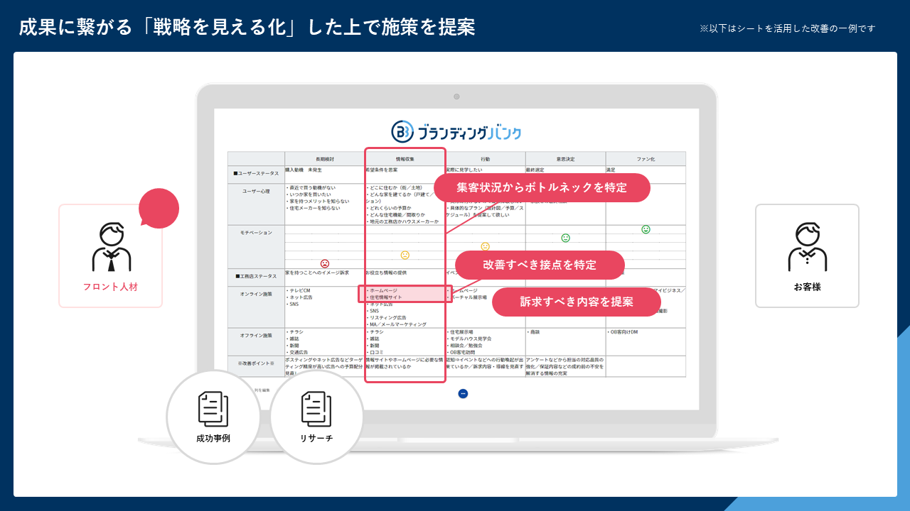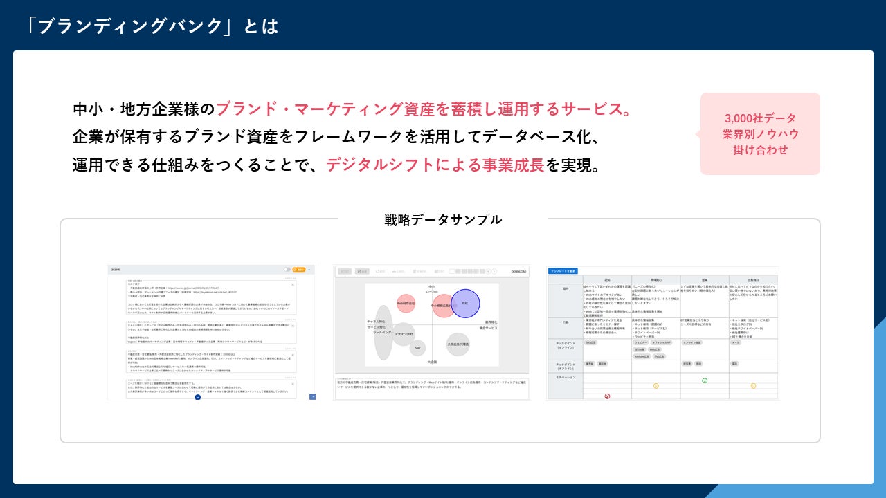 そこで2021年11月にはブランド・マーケティング戦略を見える化し、3,000社の実績から導いた成功パターンから施策提案し業績成長を実現する「ブランディングバンク」をリリースしました。