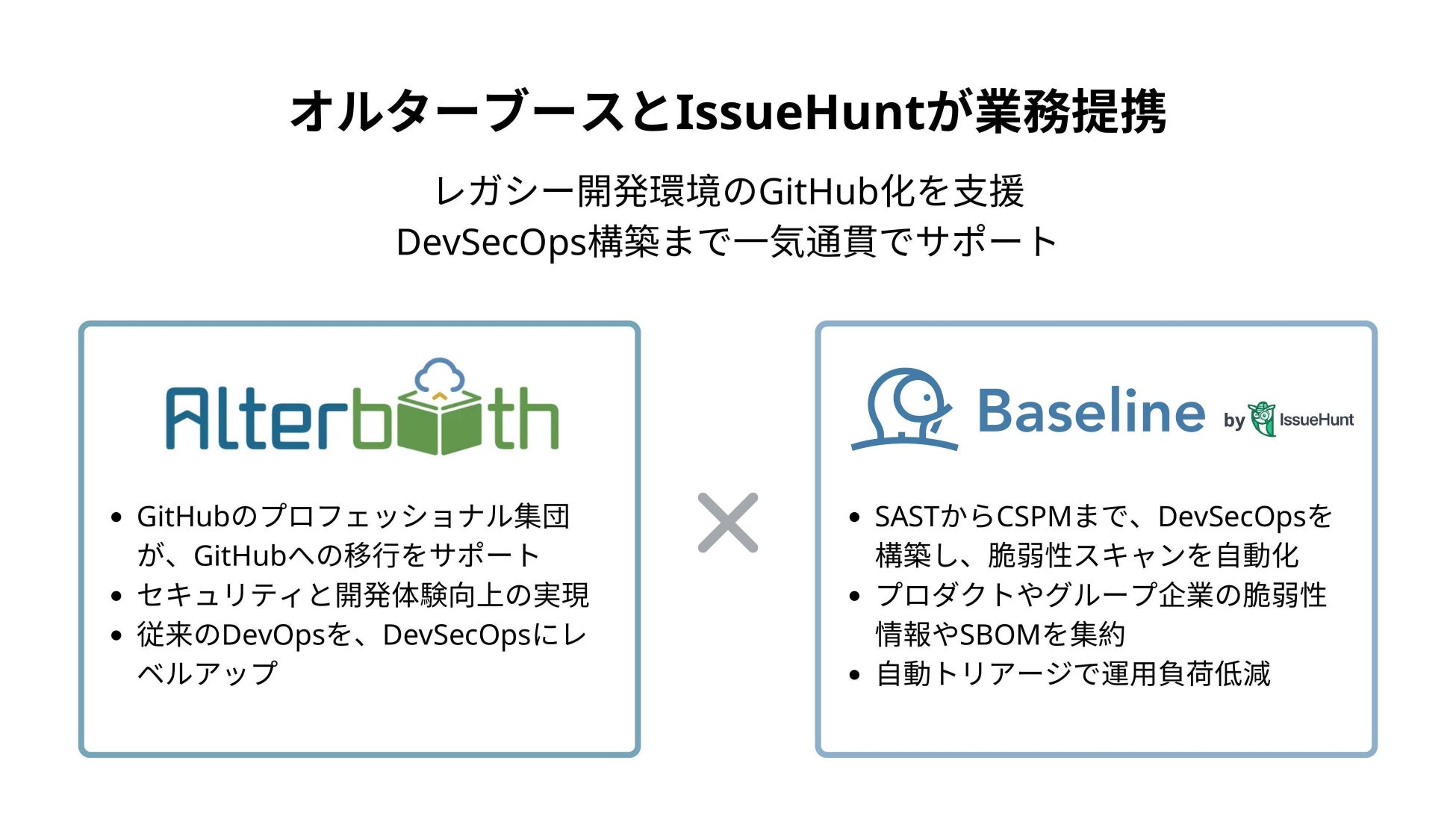 株式会社オルターブース(本社:福岡県福岡市 代表取締役:小島 淳、以下オルターブース)は、バグバウンティ・プラットフォーム「IssueHunt」や、アプリケーションセキュリティポスチャー管理(以下「ASPM」)ツール「Baseline」を提供するIssueHunt株式会社(本社:東京都中央区、代表取締役社長:横溝 一将)と、GitHub移行及びDevSecOpsの構築支援に関する業務提携を開始いたします。