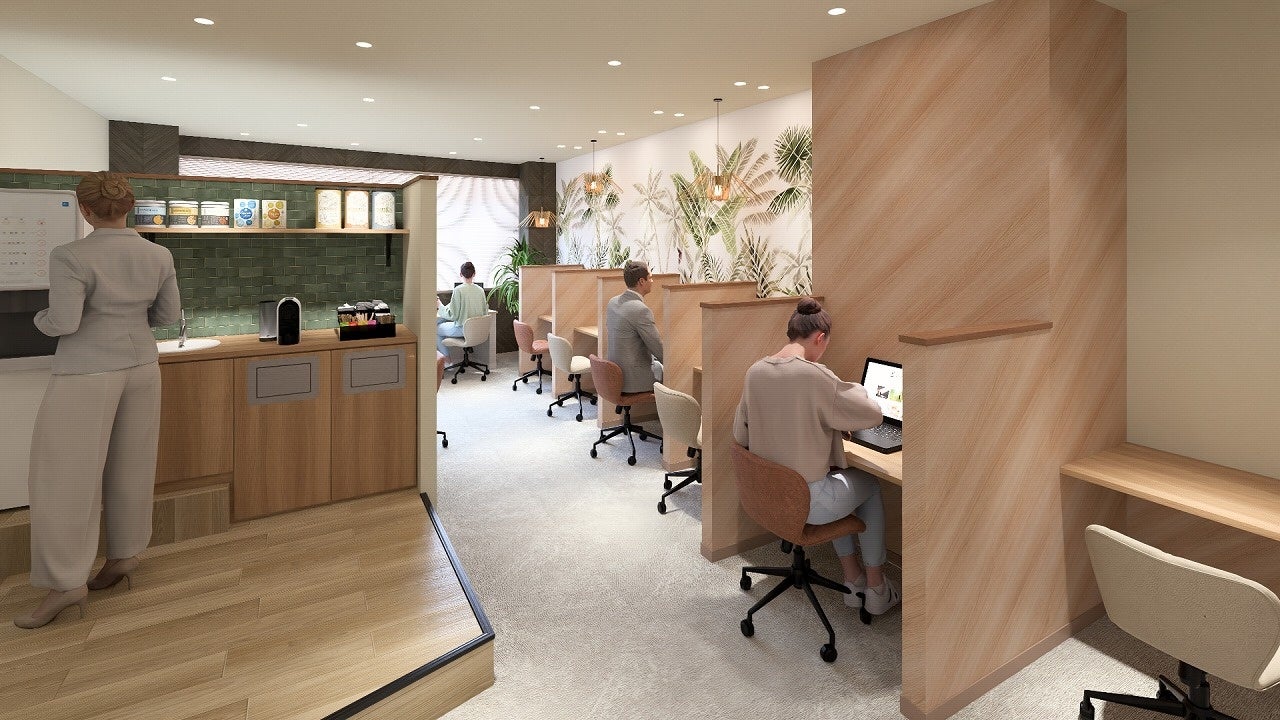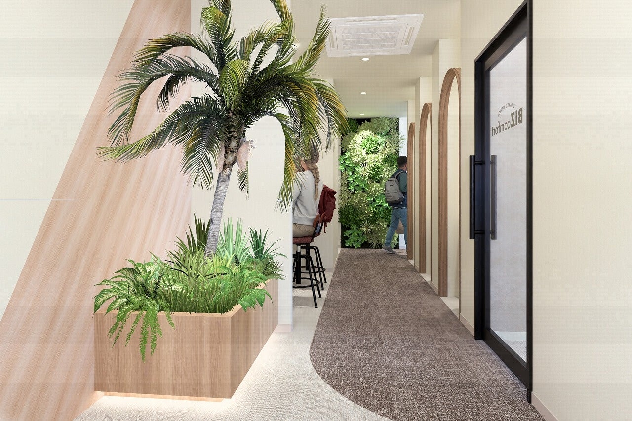 自宅にいるような「居心地の良さ」×リゾートのような「リラックス感」を組み合わせた空間を目指し、ナチュラルなベージュをメインに配色。また、自然を表現するため、壁面やフロア各所に植栽を配置し、リゾートに訪れたようなリラックスした雰囲気を演出します。