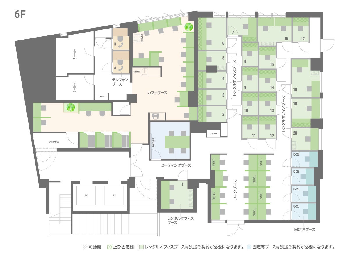 設備:Wi-Fi、フリードリンク、無料プリンター、ロッカー、ポスト、登記可、WEB会議用個室、会議室