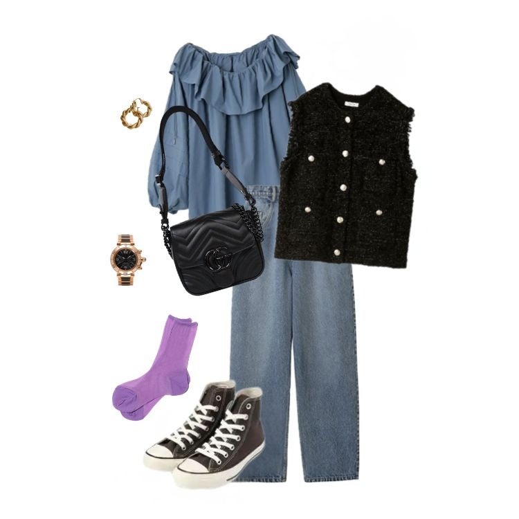 フリルブラウスとワイドデニムパンツに、パールボタンの黒のツイード調ジレを合わせた、カジュアルと上品さがミックスされたスタイルです。足元はハイカットスニーカーでリラックス感をプラスしています。 デニムと黒スニーカーの間に、ミステリアスなパープルカラーのソックスを大胆に覗かせた着こなしです。紫は魔女や魔法を連想させるハロウィンのキーカラーであり、足元という目立ちにくい部分での差し色は、大人ならではの絶妙な遊び心を感じさせます。