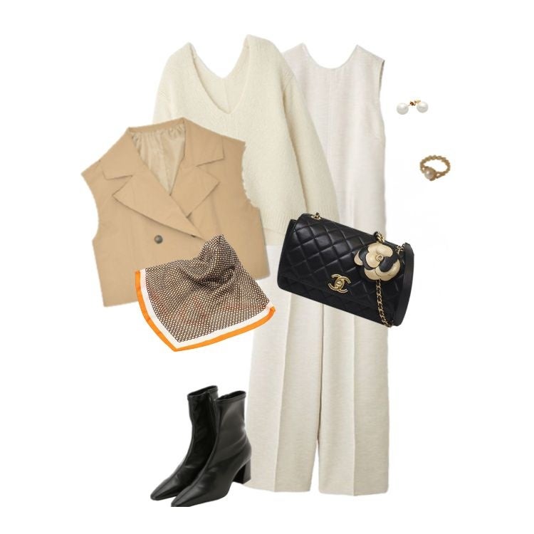 オフホワイト〜ベージュのワントーンで統一された、洗練されたレイヤードスタイルです。ニットやベストを重ねることで奥行きのある着こなしを作り出し、足元の黒いアンクルブーツが全体を上品に引き締めています。小物として取り入れたスカーフは、ベージュとブラウンの柄に鮮やかなオレンジの縁取りがアクセントになっています。パンプキンを思わせるハロウィンのメインカラーであるオレンジを、首元やバッグに結ぶことで、落ち着いたワントーンコーデに暖かみと季節感をさりげなく加え、イベントムードを盛り上げています。