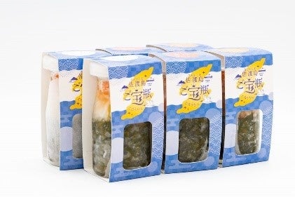 中身は佐渡の海藻や海の幸の中から、見栄えが良く、味も美味しいと思えるものに絞り、いか、いくら、海藻のながも(アカモク)、ブリ、さらに佐渡の食材として知名度が上がってきている佐渡サーモンなどをミルフィーユ上に重ね小瓶に詰め込みました。
