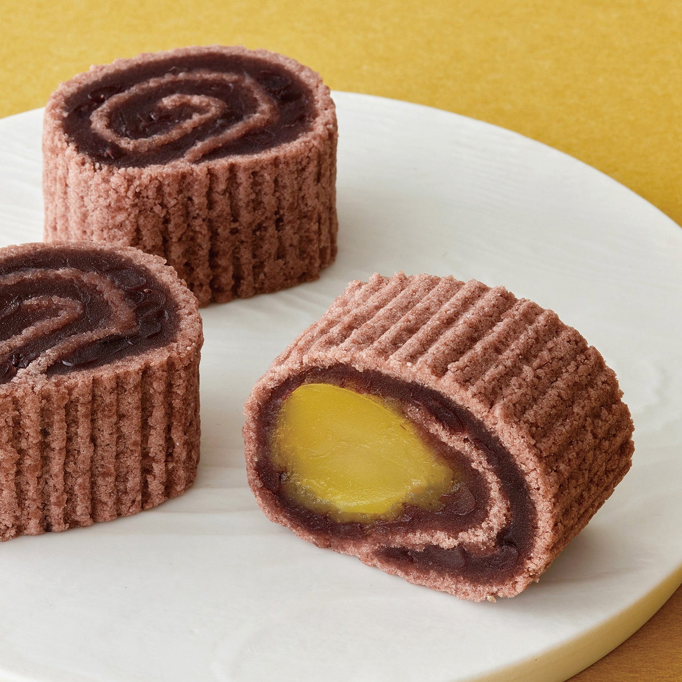 熊本県産の和栗を刻んで混ぜ込んだこしあん羊羹を、「京観世」の美味しさのひとつであるほろほろの村雨(そぼろあん)で丁寧に巻き上げました。羊羹生地には栗ペーストも練り込み、こしあん・そぼろあんの優しい甘さと共に、栗の風味をじっくりとお楽しみいただける美味しさに仕上げています。