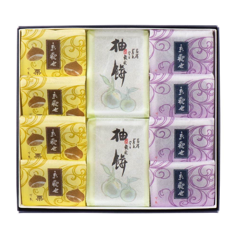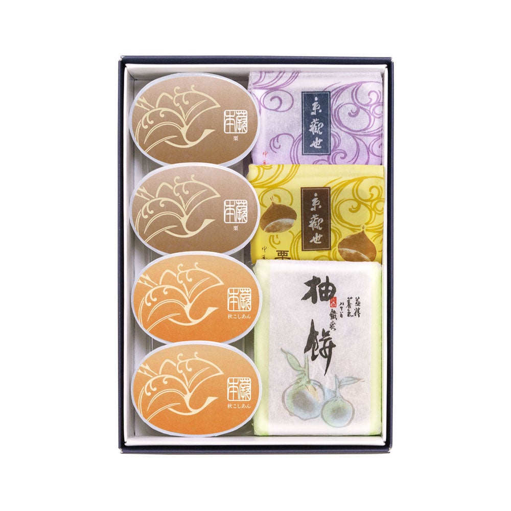 「京観世」を象徴する堂本印象画伯の「観世水」意匠をあしらい、秋らしい色合いに。季節の商品や「京観世」棹・個包装ともお詰合せでき、秋のご挨拶やお手土産にも便利な一品です。