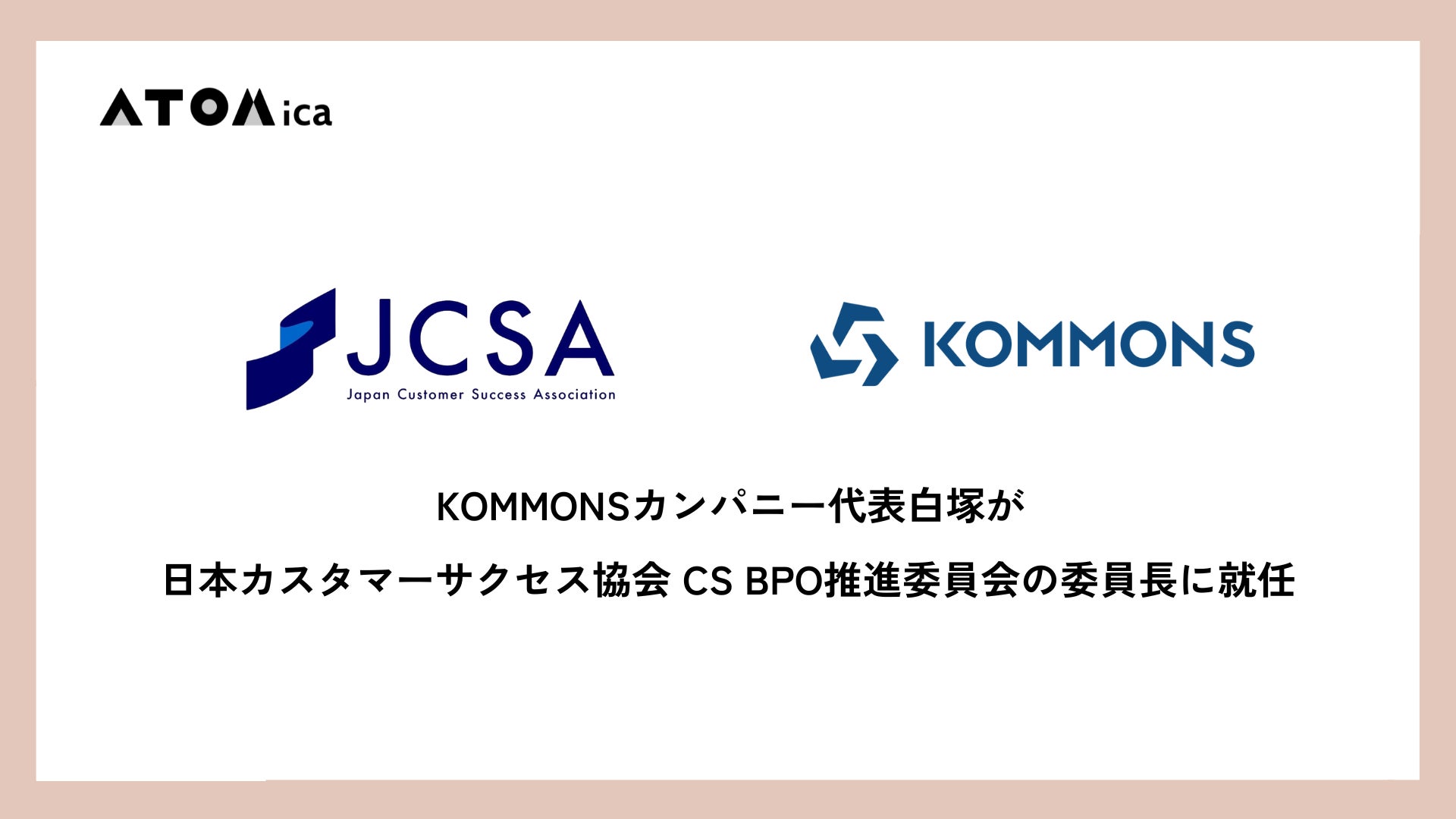 ソーシャルコワーキング®︎スタートアップの株式会社ATOMica(本社:宮崎県宮崎市、代表取締役:嶋田 瑞生、南原 一輝、以下ATOMica)は、ATOMicaのKOMMONSカンパニー(カンパニーCEO:白塚 湧士)代表の白塚 湧士が、2025年8月1日付で、一般社団法人日本カスタマーサクセス協会 CS BPO推進委員会 委員長に就任したことをお知らせいたします。