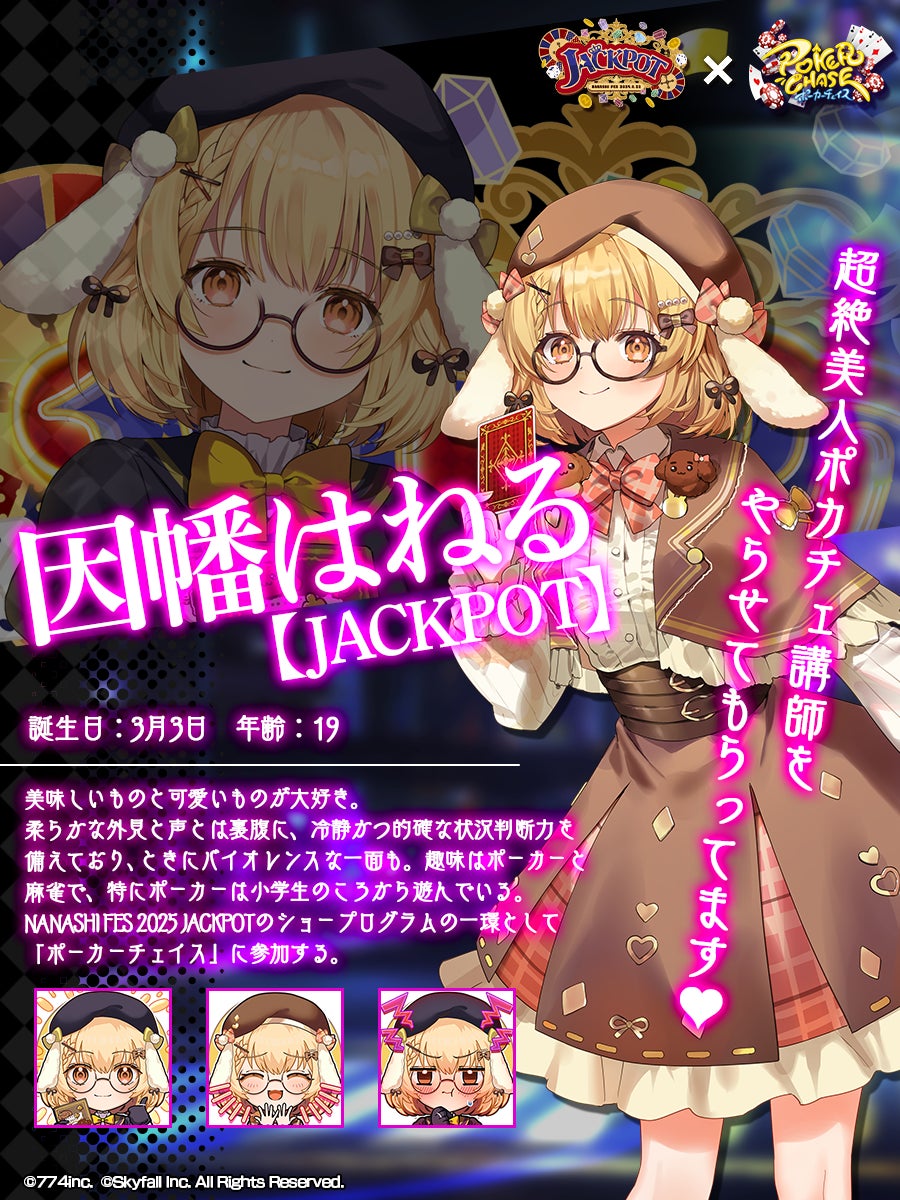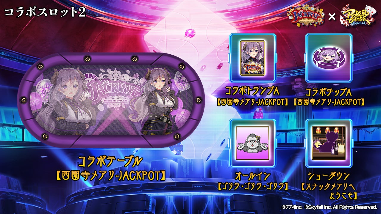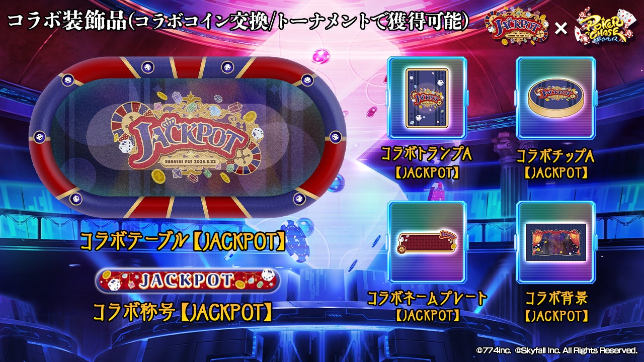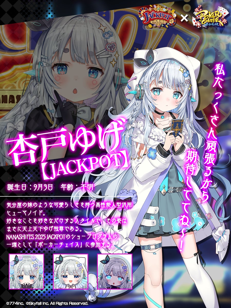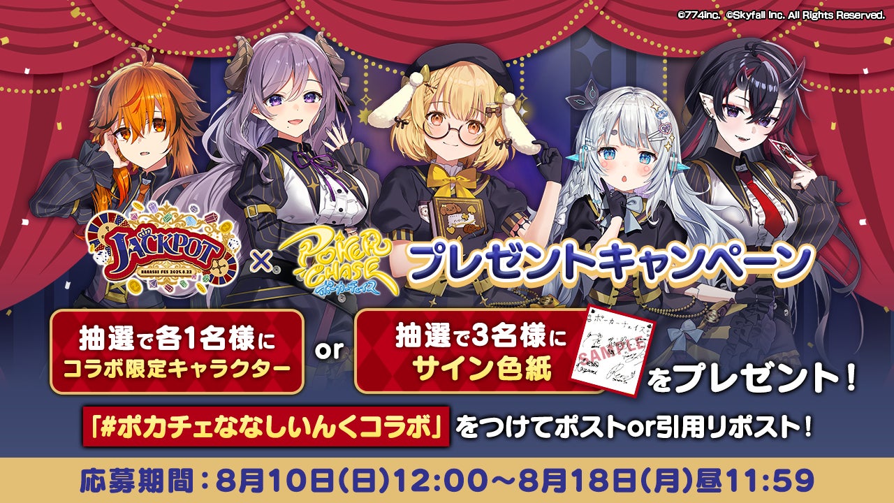 株式会社Skyfall(東京都港区 代表取締役社長:長谷川 智一、以下Skyfall)が運営するバトロワ式オンラインポーカーゲーム『ポーカーチェイス』は、Vtuber事務所「ななしいんく」が開催するライブイベント「NANASHI FES 2025 "JACKPOT"」に出演する人気タレントと、2025年8月25日(月) 〜 9月17日(水)の期間限定でコラボイベントを開催することが決定しました。