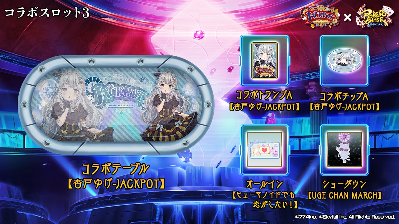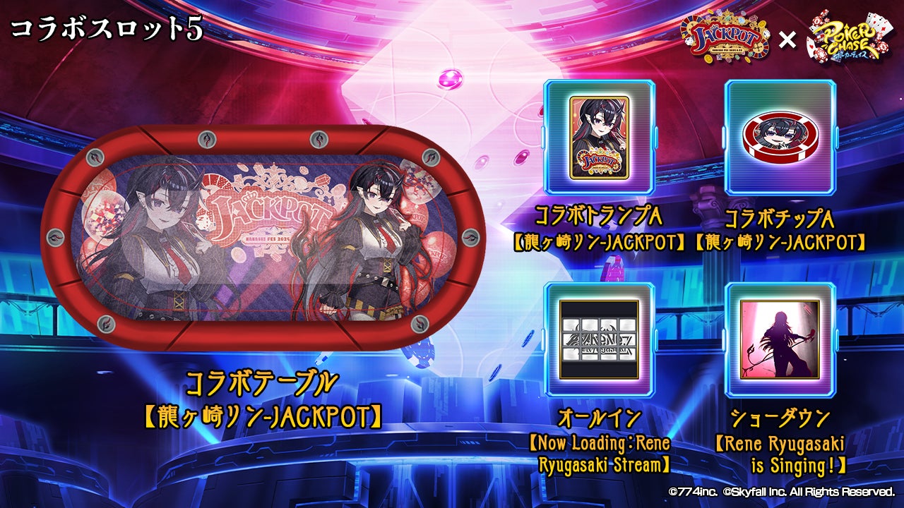 プレイアブルキャラとして「因幡はねる-JACKPOT」「西園寺メアリ-JACKPOT」「杏戸ゆげ-JACKPOT」「風見くく-JACKPOT」「龍ヶ崎リン-JACKPOT」が登場するスロットを開催します。コラボ開催期間中、コラボキャラクター5名が登場するスロットの他、特定のキャラクターにおいてピックアップ率が高くなっているスロットも登場します。