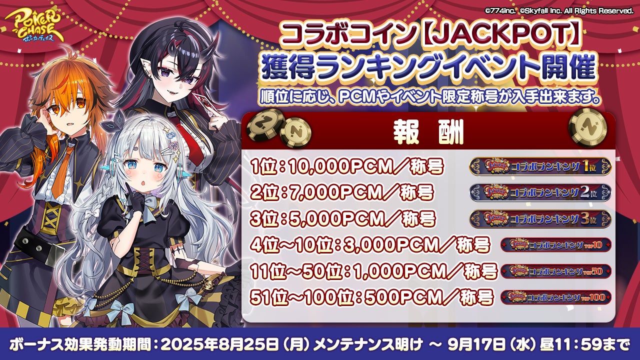 コラボ開催期間中に「コラボコイン【JACKPOT】」の総獲得枚数を競う、獲得ランキングイベントを開催します。PCMに加えて、順位に応じてイベント限定称号が入手できます。