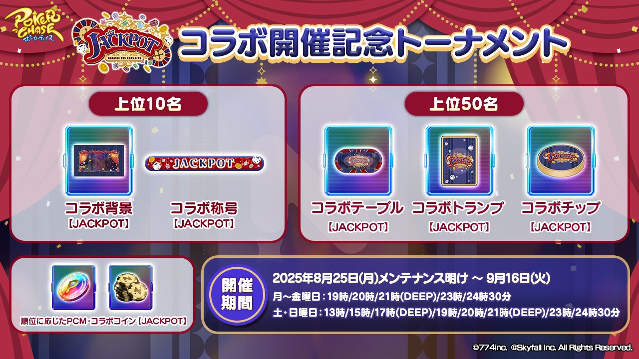 順位に応じたPCMやコラボコイン【JACKPOT】を獲得できるトーナメントを是非お楽しみください!
