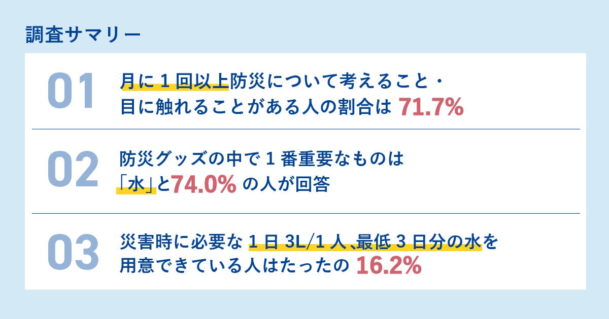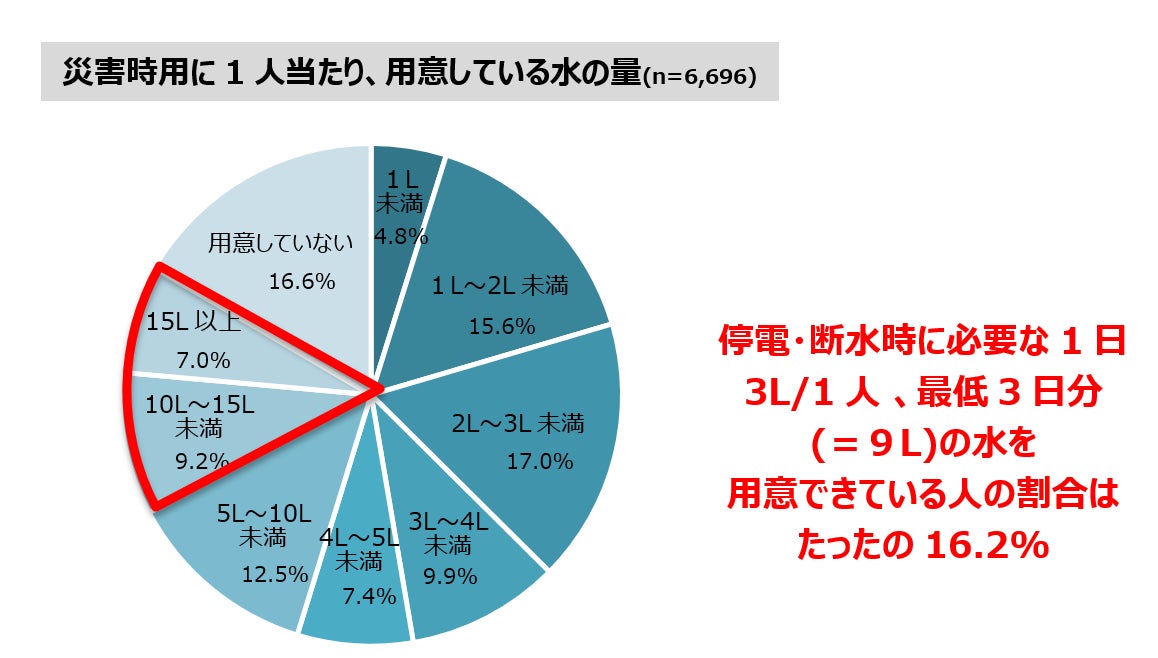 一方、災害時に必要な1日3L/1人 、最低3日分の水を用意できている人はたったの16.2%という結果に。