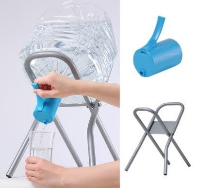 ウォーターサーバー無しで使用できる「非常用キット」は、「水ボトル専用置台」とボトルに装着する「専用コック」がセットになっているので、災害による停電・断水時の対策としておすすめです。屋外でも使用可能で、外へ避難する際にも役立ちます。