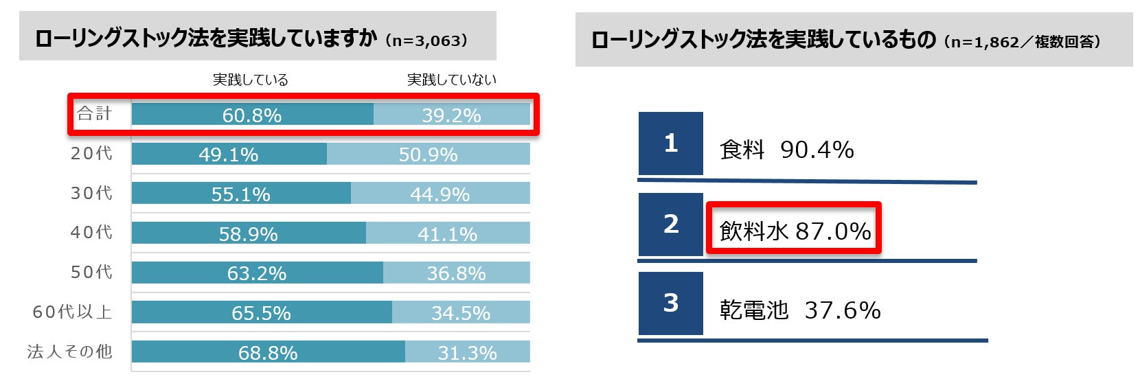 一方ローリングストック法を知っている人の中で、実践している人の割合は60.8%も。また実践しているものの第1位は「食料」で90.4%、第2位は「飲料水」で87.0%という結果に。