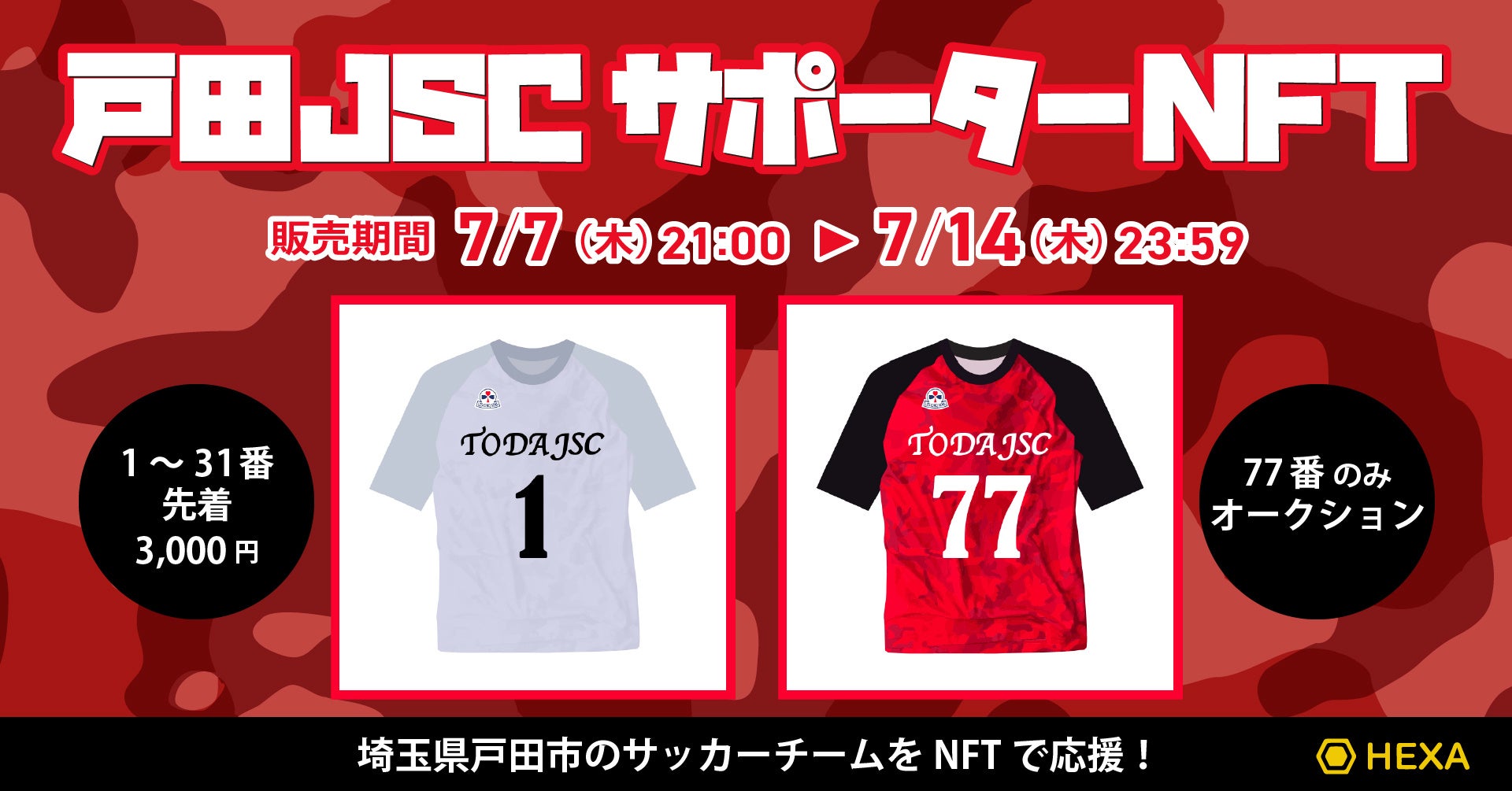 NFTマーケットのHEXA(ヘキサ)では、埼玉県戸田市の社会人サッカーチーム「戸田JSC」のサポーターNFTを7/7(木)21時から販売します。