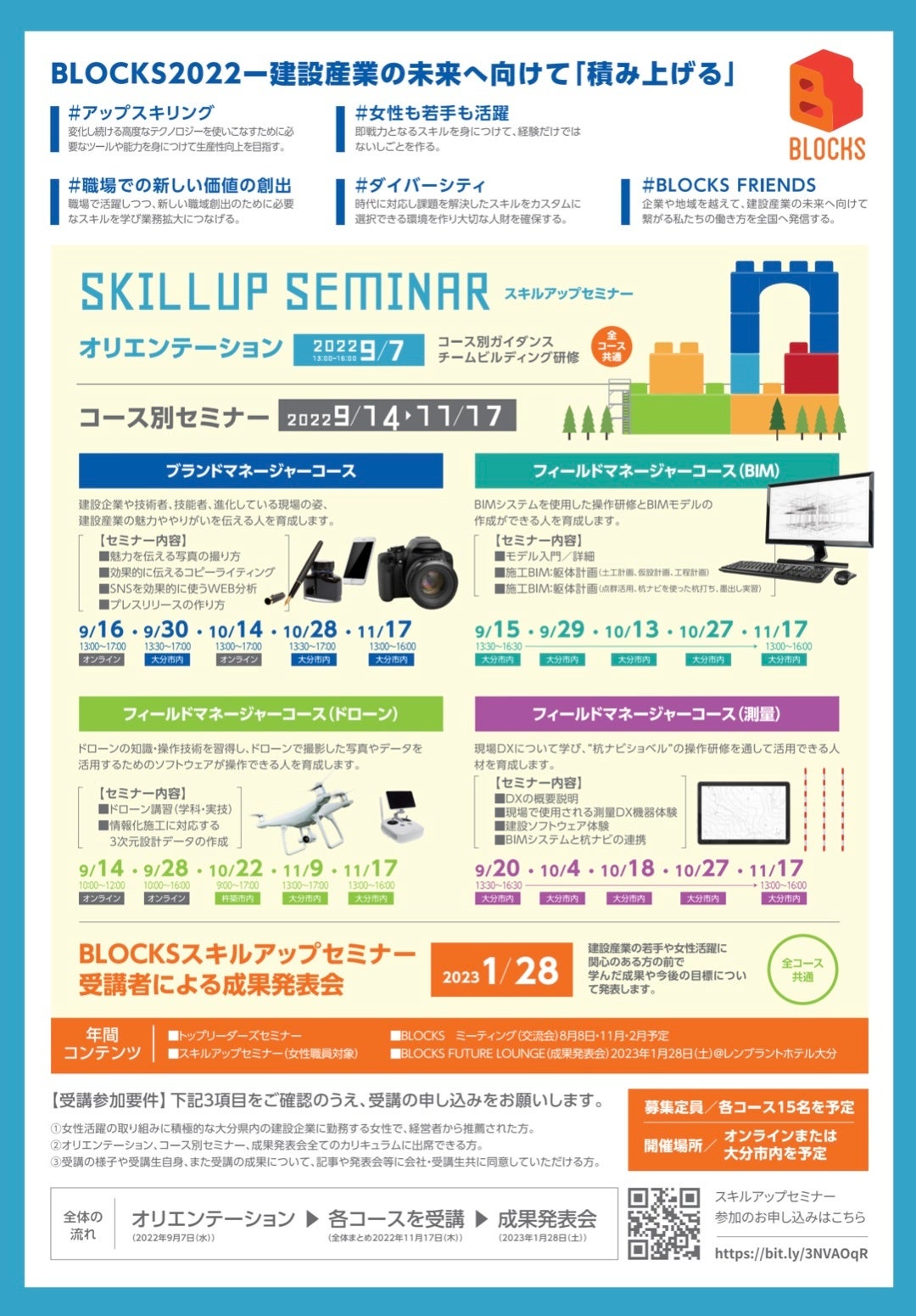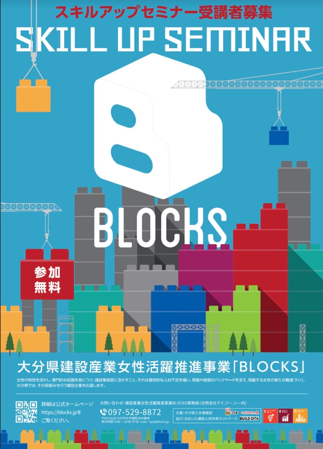 大分県では、女性の新しい領域の働き方を創り、地域を守る建設産業としての誇りを忘れず、建設産業の新たな未来を「積み上げる」というコンセプトのもと、2020年度に「大分県建設産業女性活躍推進事業(BLOCKS)」をスタートしました。建設産業で活躍する女性を可視化し、会社や職域を超えて未来に繋いでいくことを目指し、経営者向けのセミナーや、女性の職域拡大に向けたスキルアップセミナーのほか、交流会などを通じたネットワーク構築にも取組んでいるところです。大分県の建設産業が、日本で1番「女性が輝きながら能力を発揮できる場所」となることを目指して、今年度もみんなで「積み上げて」いきます。
